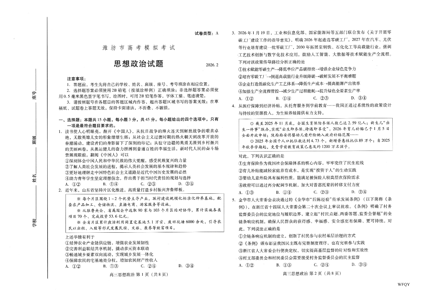 高三政治--山东省潍坊市2026.2高三模拟