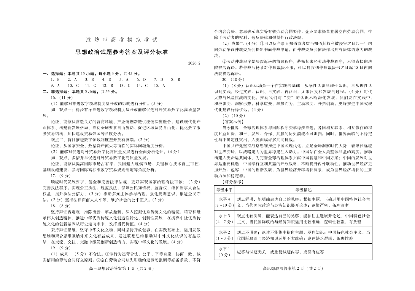高三政治答案--山东省潍坊市2026.2高三模拟