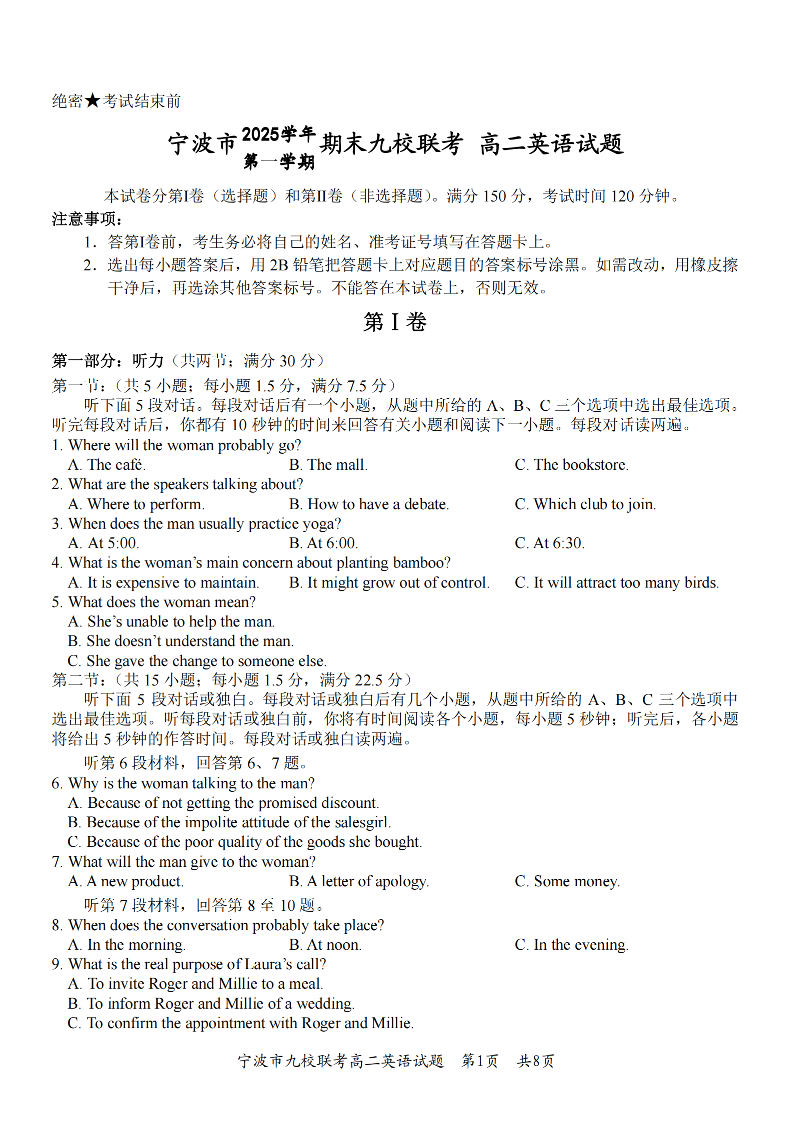 高二英语--浙江省宁波市九校2025-2026学年高二上学期期末联考