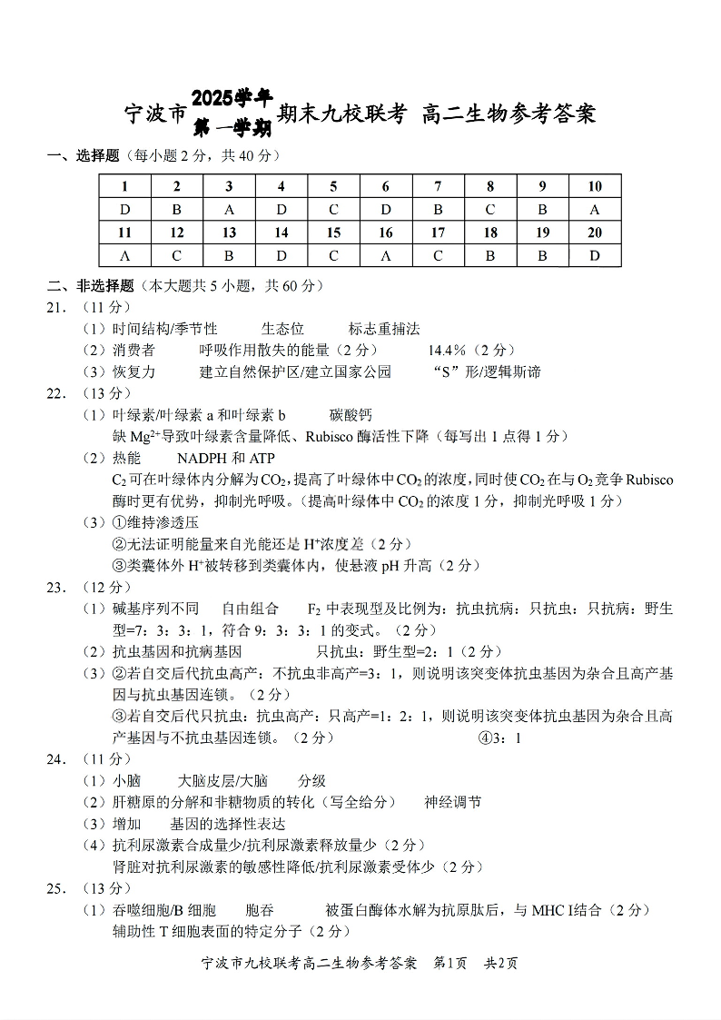 高二生物答案--浙江省宁波市九校2025-2026学年高二上学期期末联考