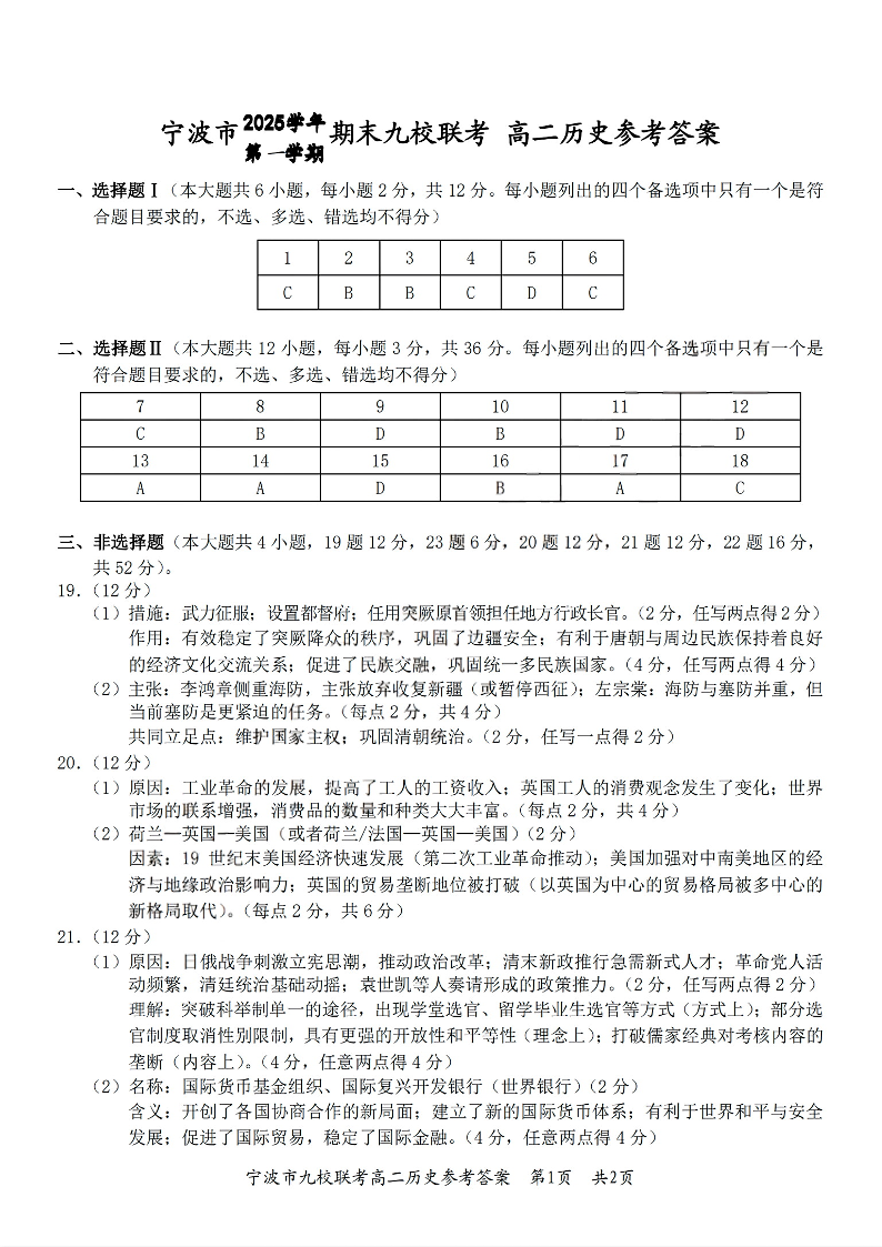 高二历史答案--浙江省宁波市九校2025-2026学年高二上学期期末联考