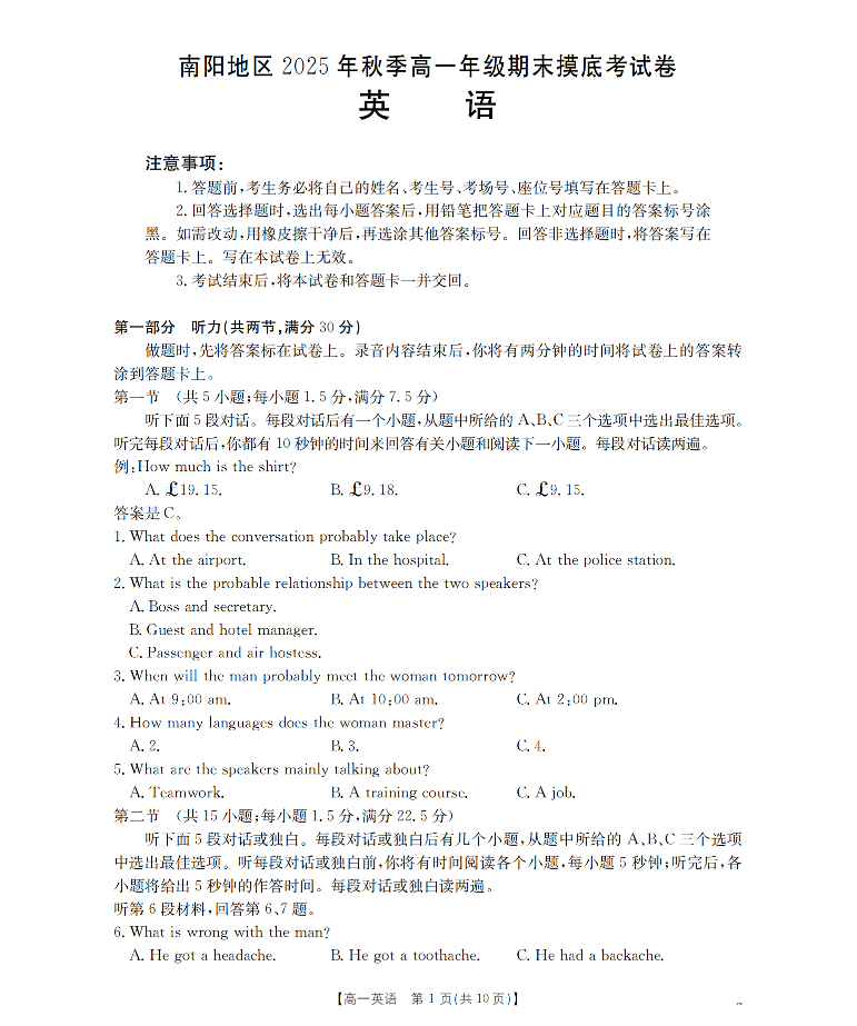 高一英语--河南省南阳地区2025-2026学年高一上学期期末摸底考试