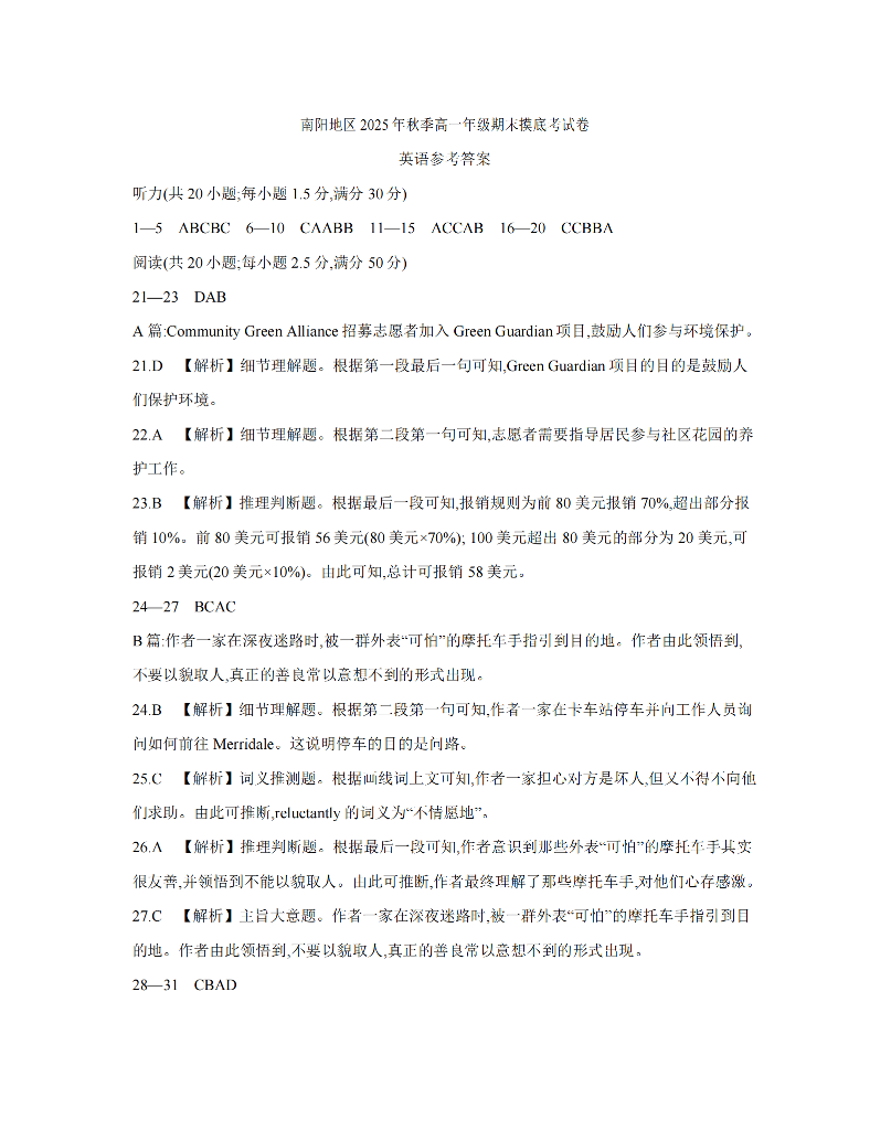 高一英语答案--河南省南阳地区2025-2026学年高一上学期期末摸底考试