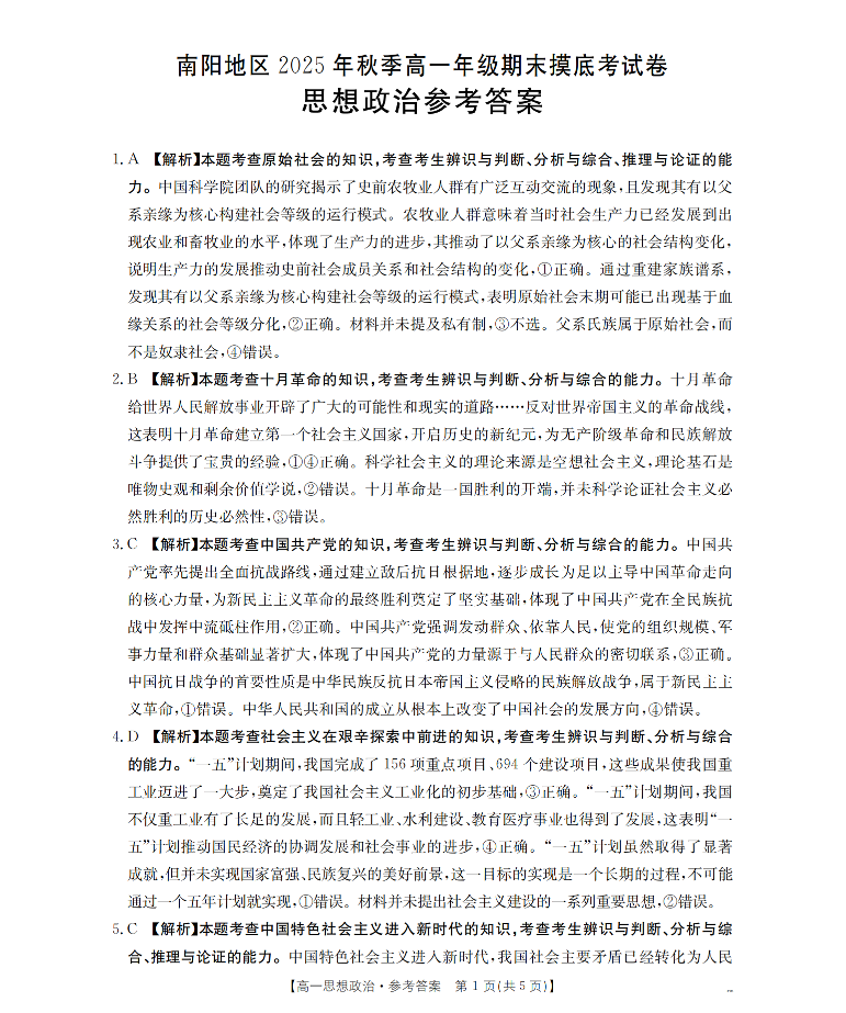 高一政治答案--河南省南阳地区2025-2026学年高一上学期期末摸底考试