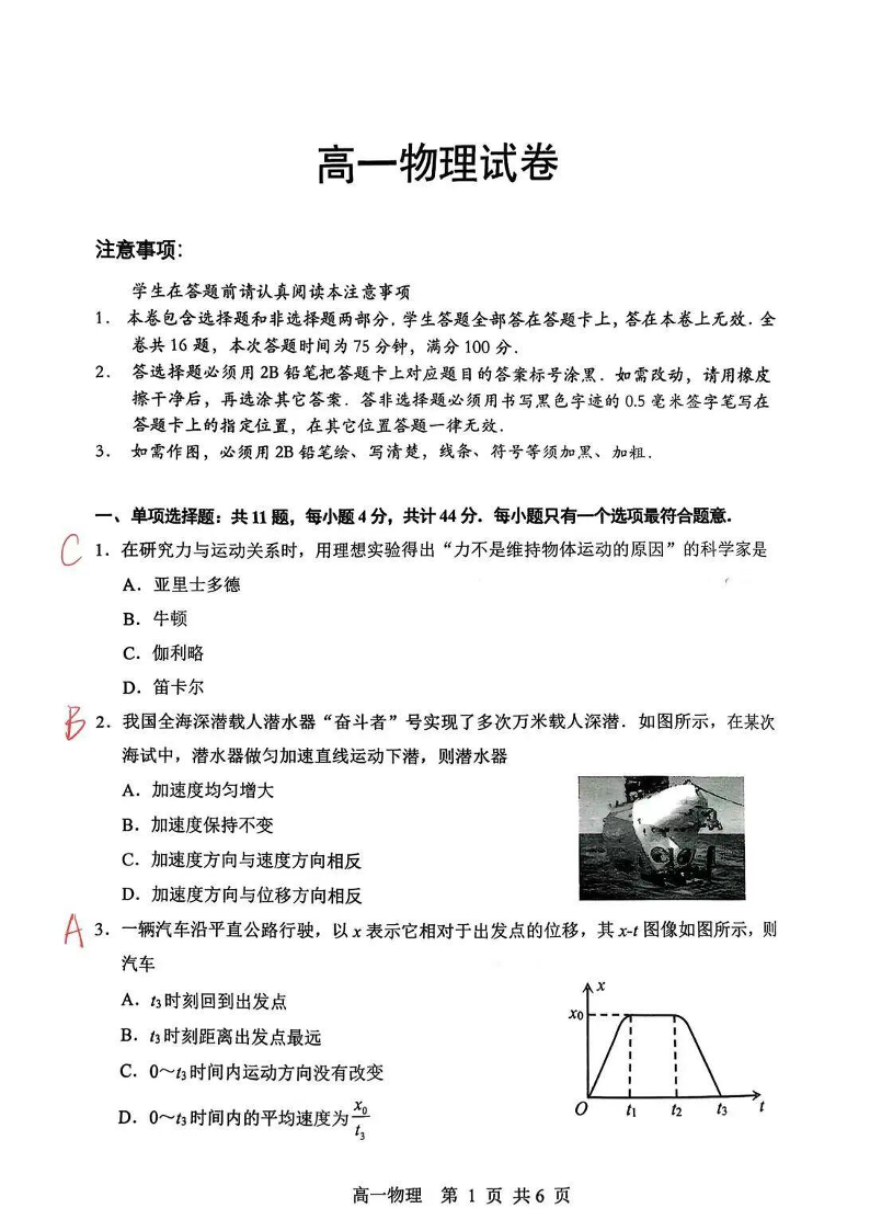 高一物理+答案--江苏省苏州市2025-2026学年度高一上学期期末考试