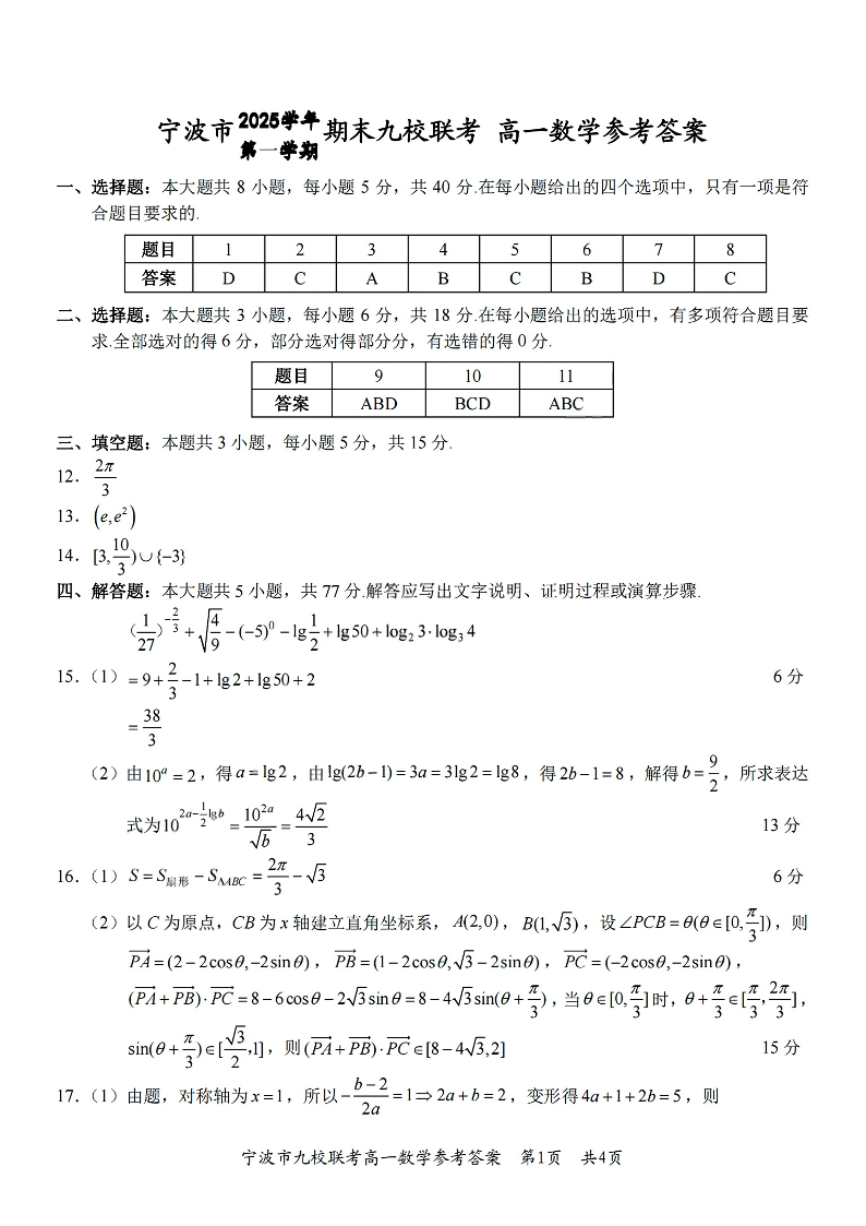 高一数学答案--浙江省宁波市九校2025-2026学年高一上学期期末联考
