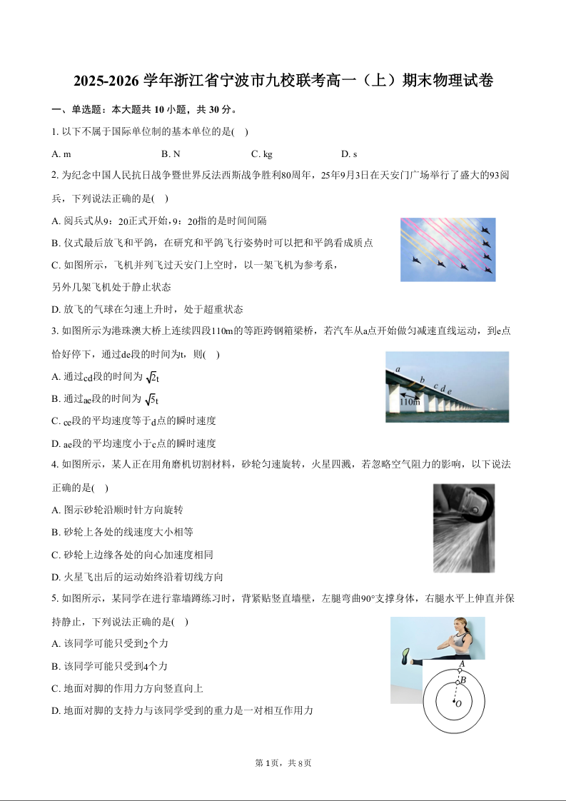 高一物理+答案--浙江省宁波市九校2025-2026学年高一上学期期末联考
