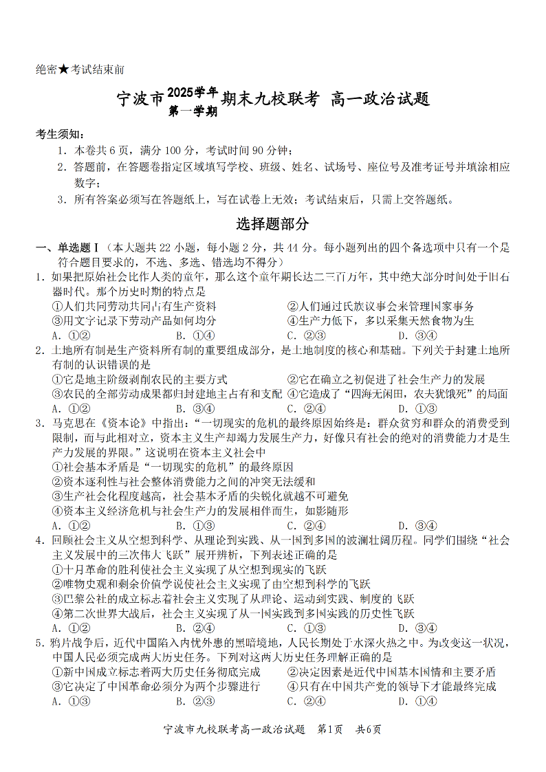 高一政治--浙江省宁波市九校2025-2026学年高一上学期期末联考