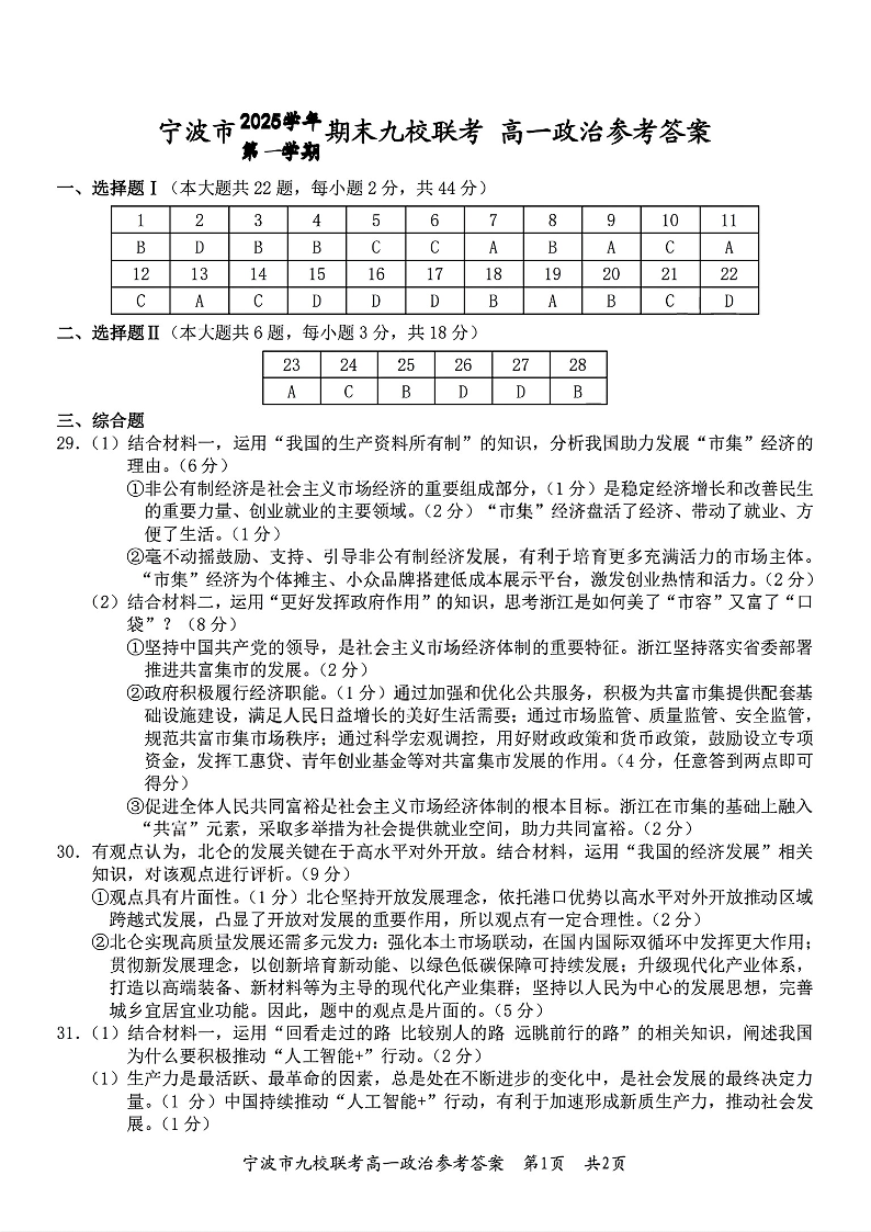 高一政治答案--浙江省宁波市九校2025-2026学年高一上学期期末联考