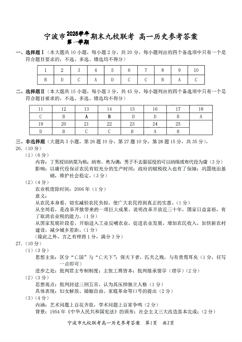 高一历史答案--浙江省宁波市九校2025-2026学年高一上学期期末联考