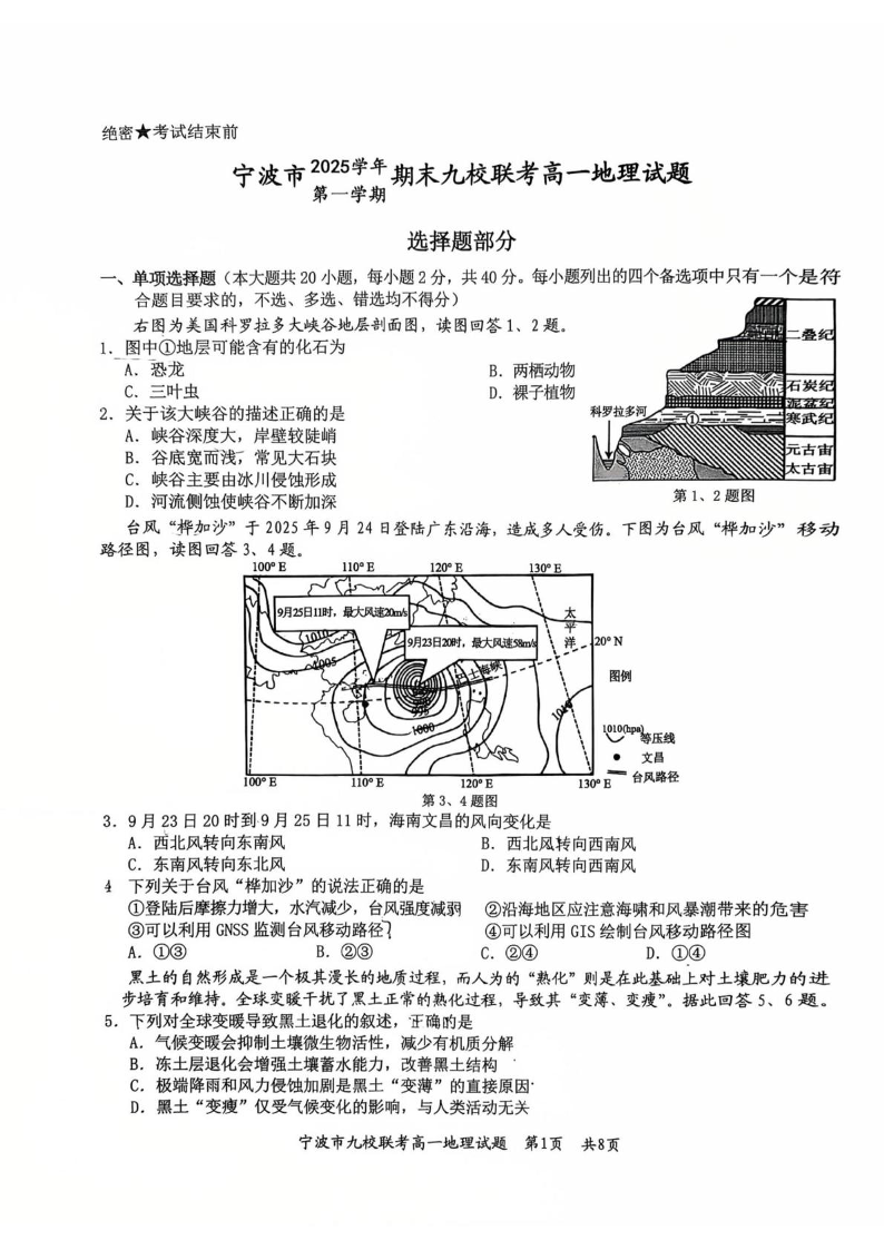 高一地理--浙江省宁波市九校2025-2026学年高一上学期期末联考