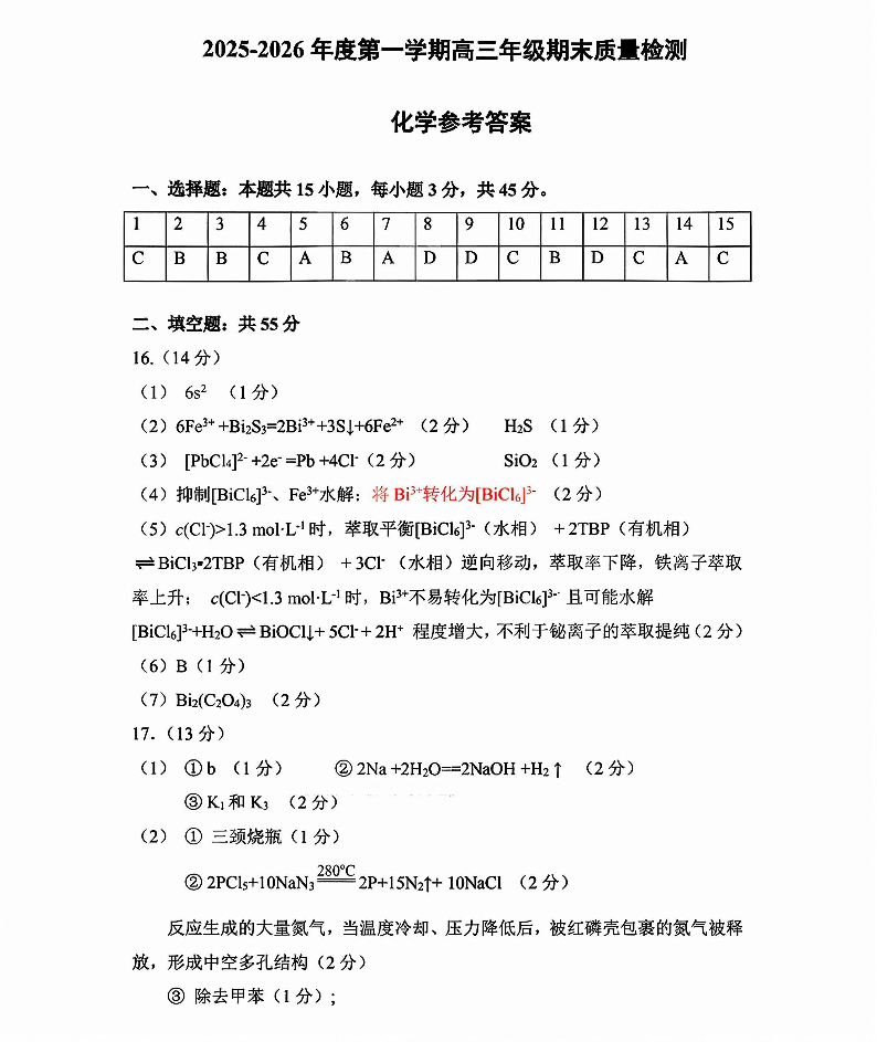 高三化学答案--内蒙古包头市2026届高三上学期期末教学质量检测试卷