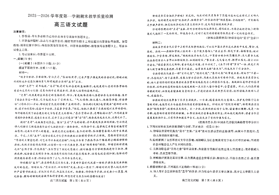 高三语文--山东省聊城市2026届高三上学期期末教学质量检测