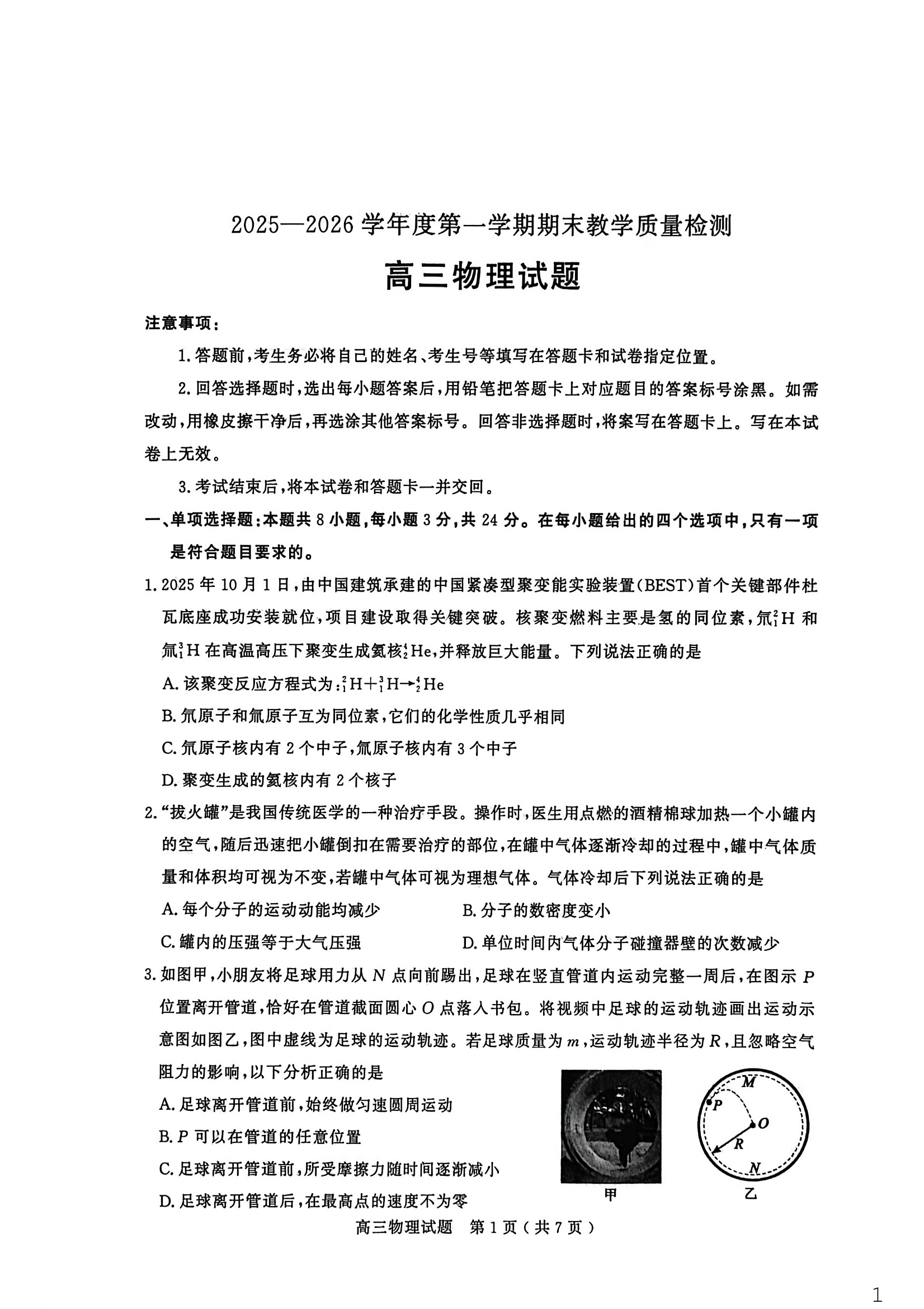 高三物理--山东省聊城市2026届高三上学期期末教学质量检测