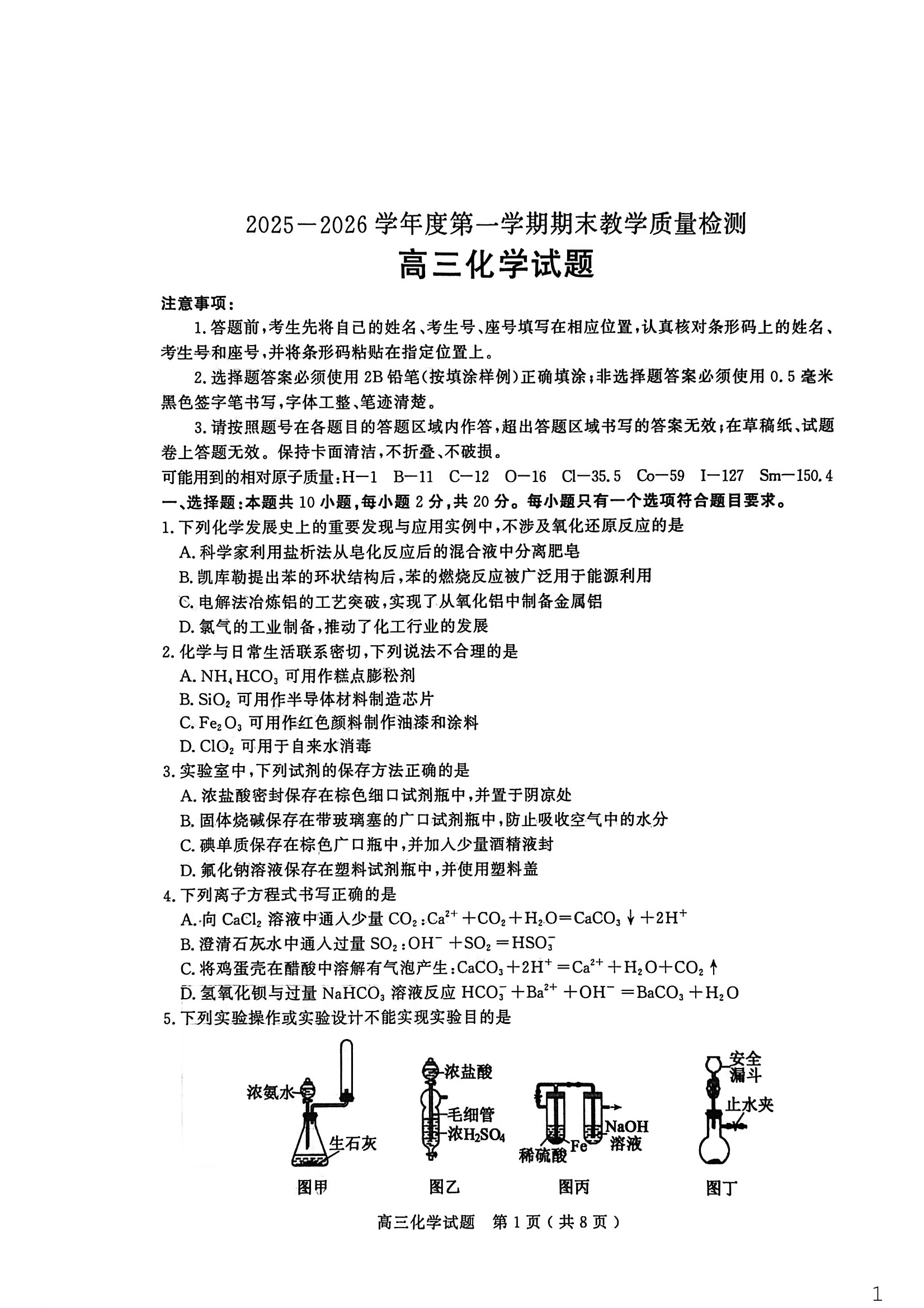 高三化学--山东省聊城市2026届高三上学期期末教学质量检测