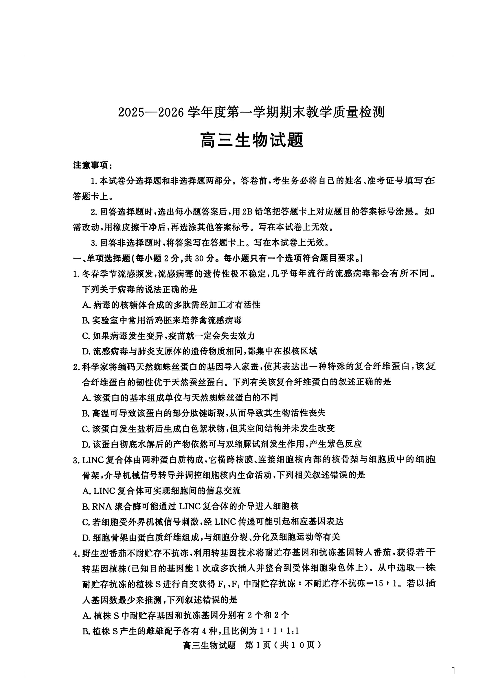 高三生物--山东省聊城市2026届高三上学期期末教学质量检测
