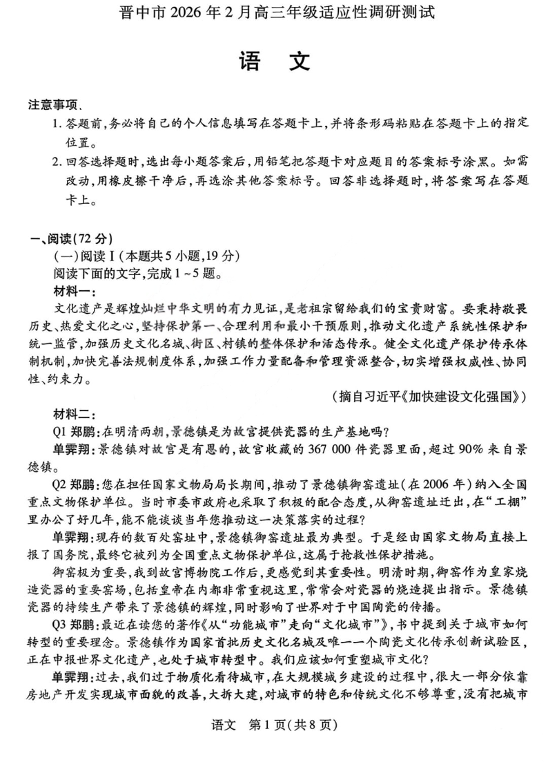 高三语文--山西省晋中市2026届高三年级2月适应性调研考试(晋中一模)