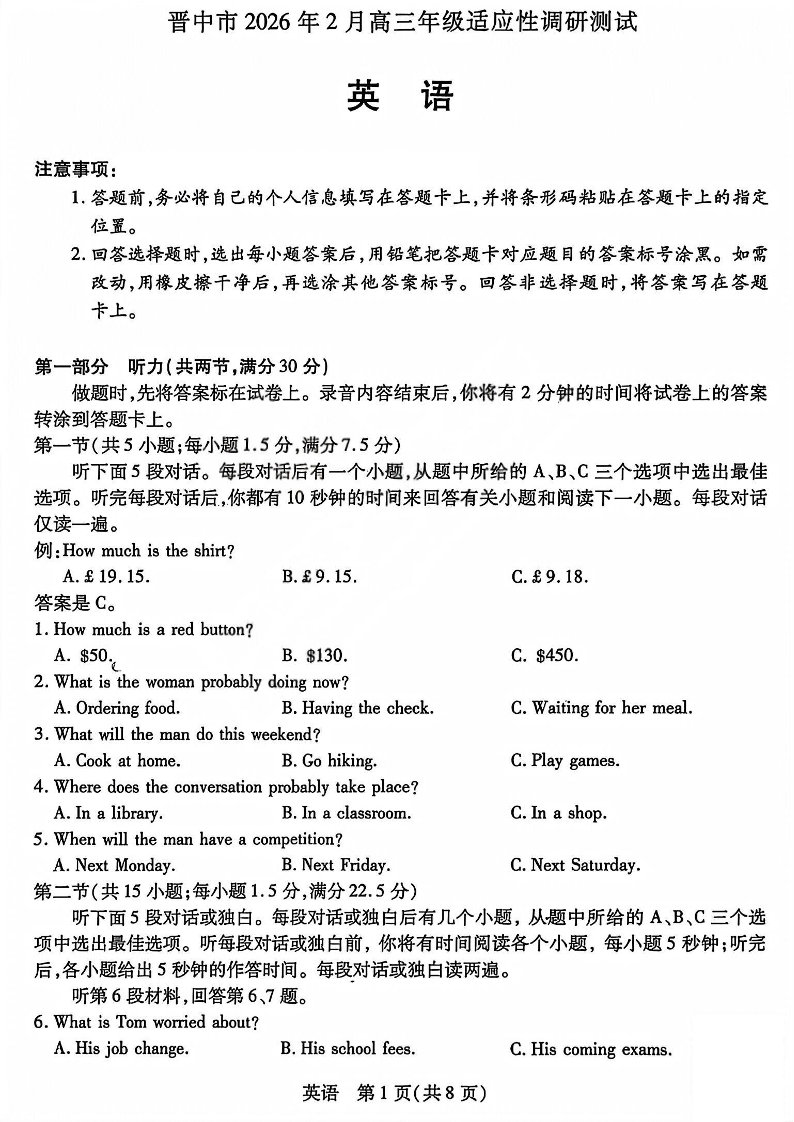 高三英语--山西省晋中市2026届高三年级2月适应性调研考试(晋中一模)