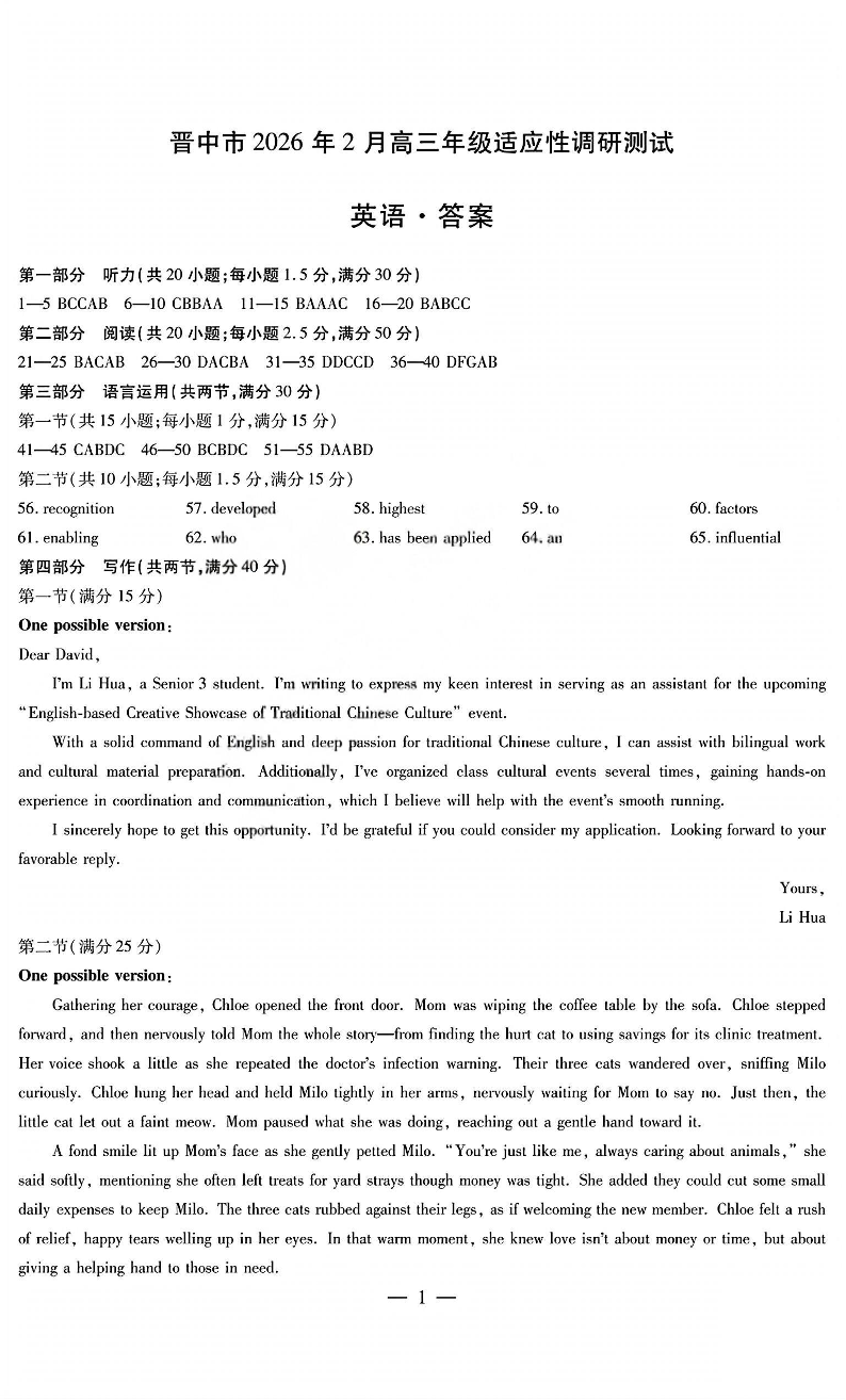 高三英语答案--山西省晋中市2026届高三年级2月适应性调研考试(晋中一模)
