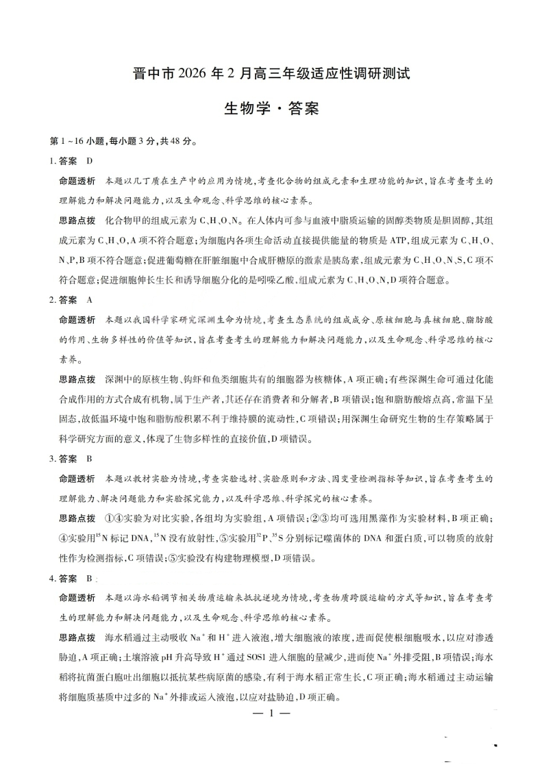 高三生物答案--山西省晋中市2026届高三年级2月适应性调研考试(晋中一模)