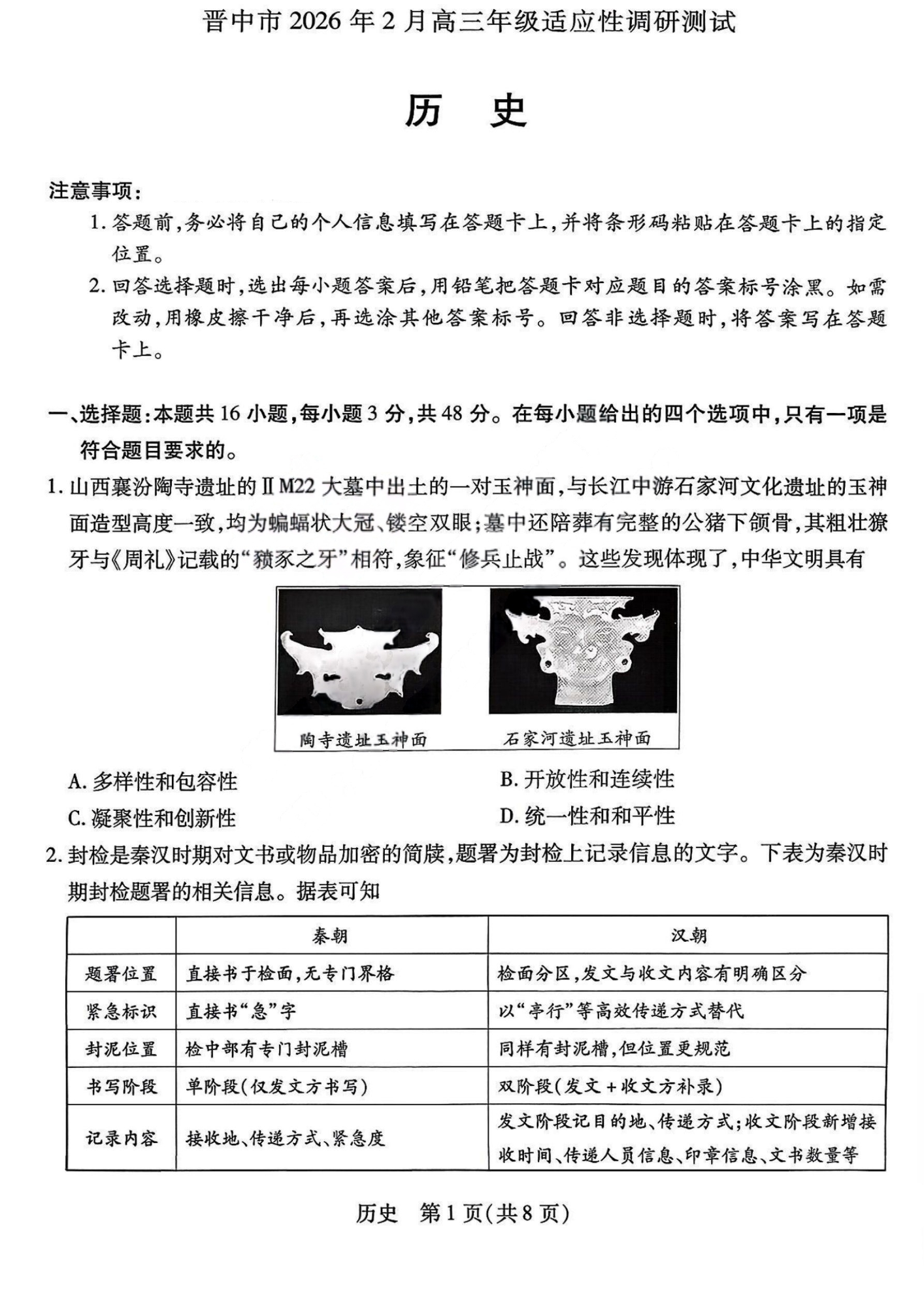 高三历史--山西省晋中市2026届高三年级2月适应性调研考试(晋中一模)