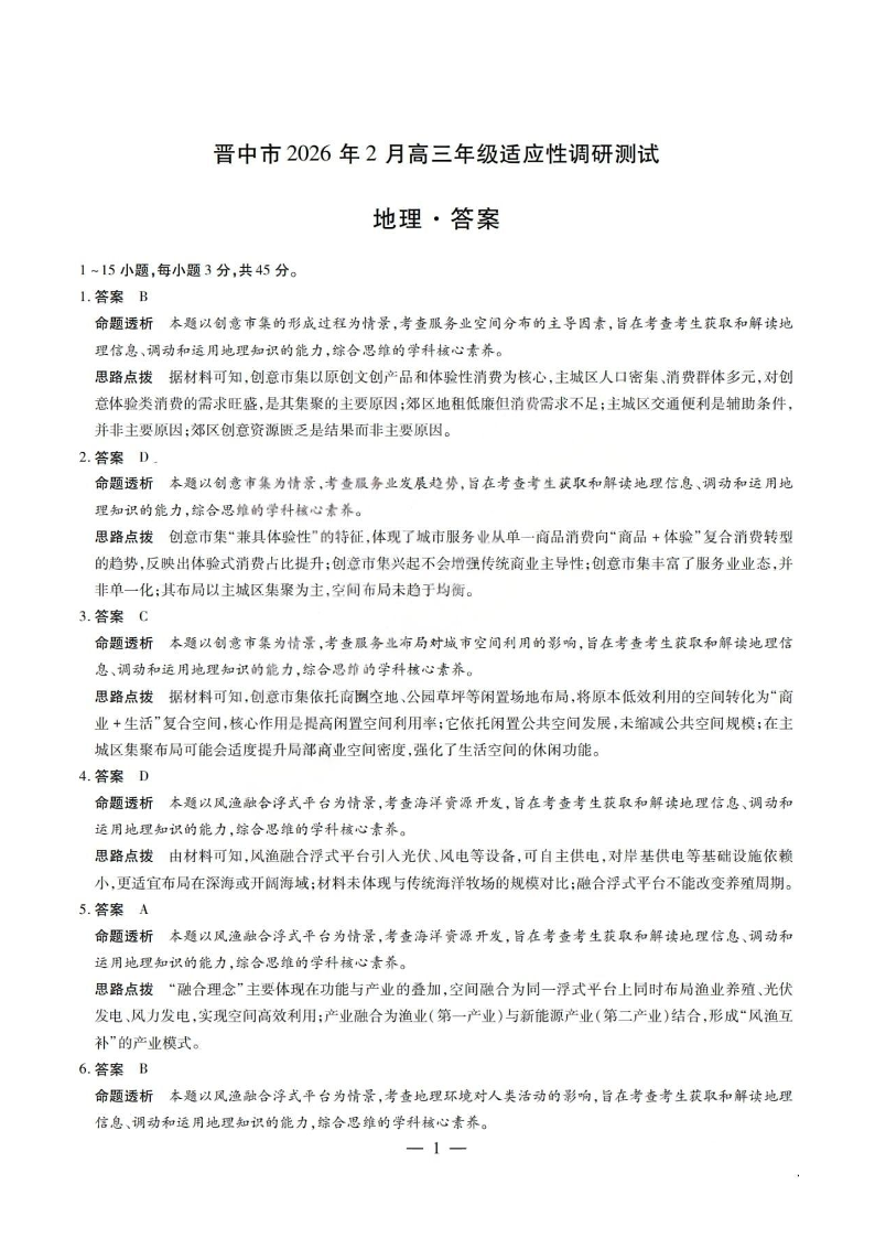高三地理答案--山西省晋中市2026届高三年级2月适应性调研考试(晋中一模)