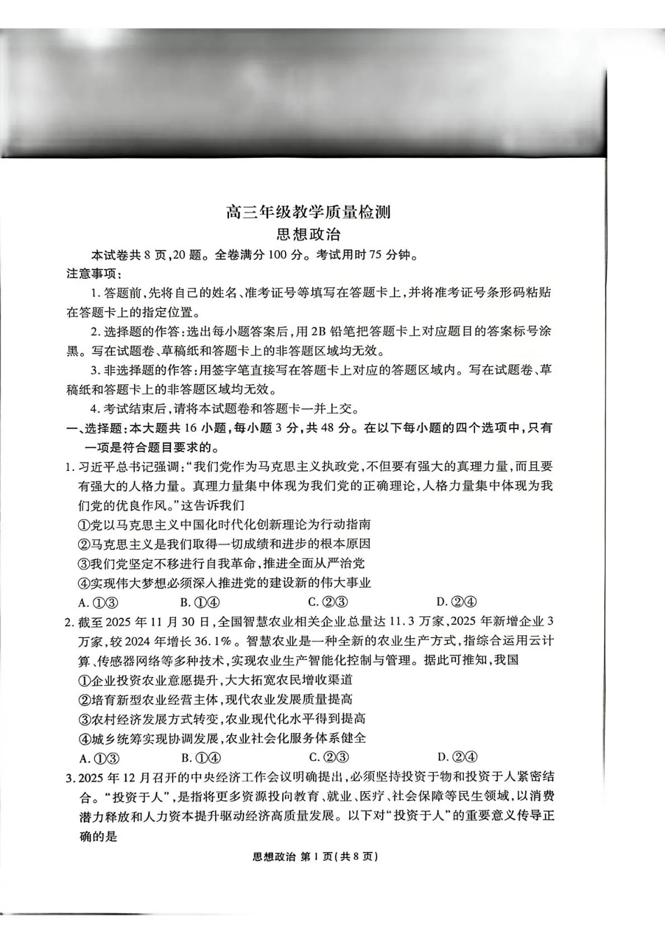 高三政治--陕西省衡水金卷2026届高三上学期2月联考