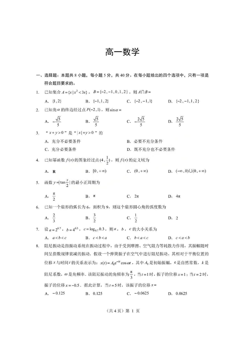 高一数学+答案--湖北省孝感市楚天协作体2025-2026学年度上学期高一年级期末考试