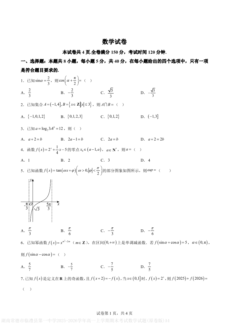 高一数学--湖南省常德市沅澧共同体2025-2026学高一上学期期末考试