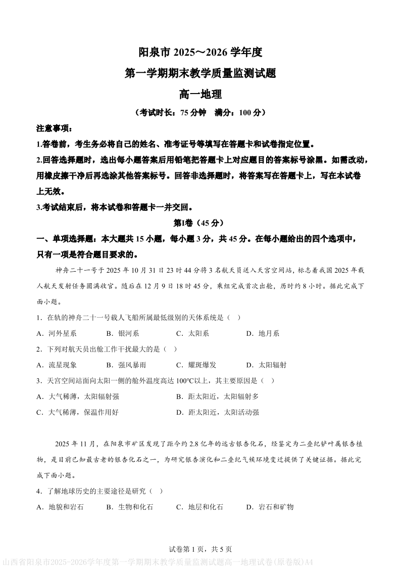 高一地理--山西省阳泉市2025-2026学年上学高一期期末考试