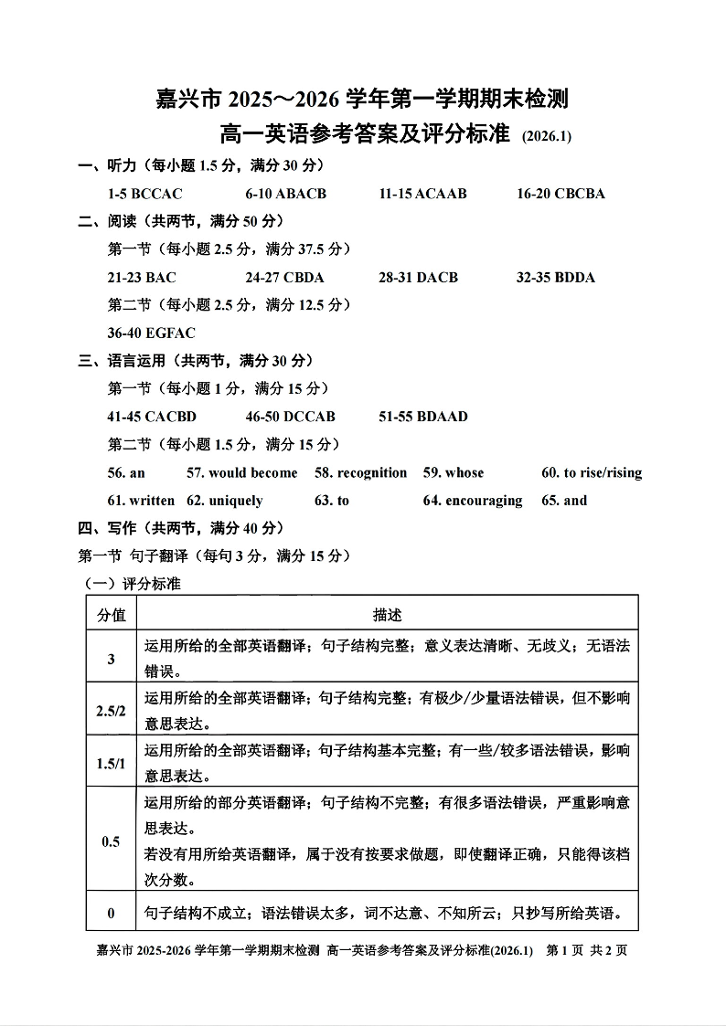 高一英语答案--浙江省嘉兴市2025-2026学年高一上学期期末考试