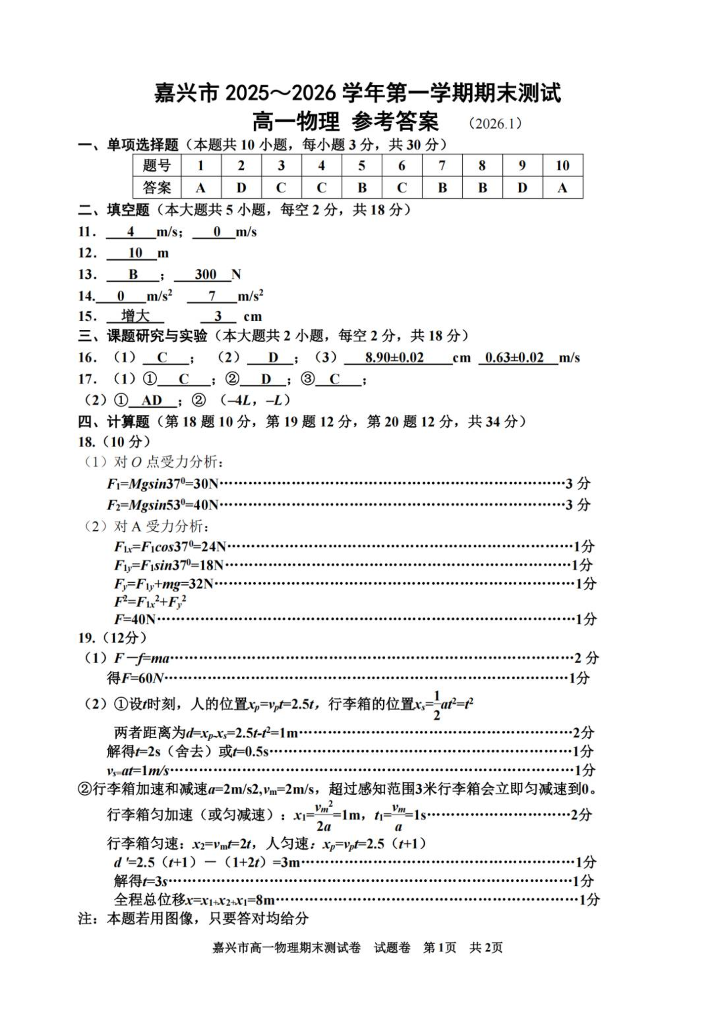 高一物理答案--浙江省嘉兴市2025-2026学年高一上学期期末考试