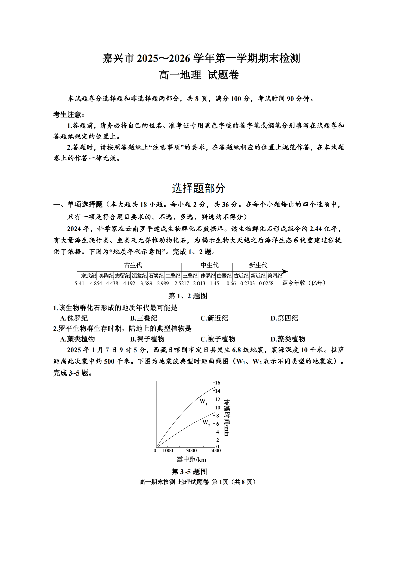 高一地理--浙江省嘉兴市2025-2026学年高一上学期期末考试