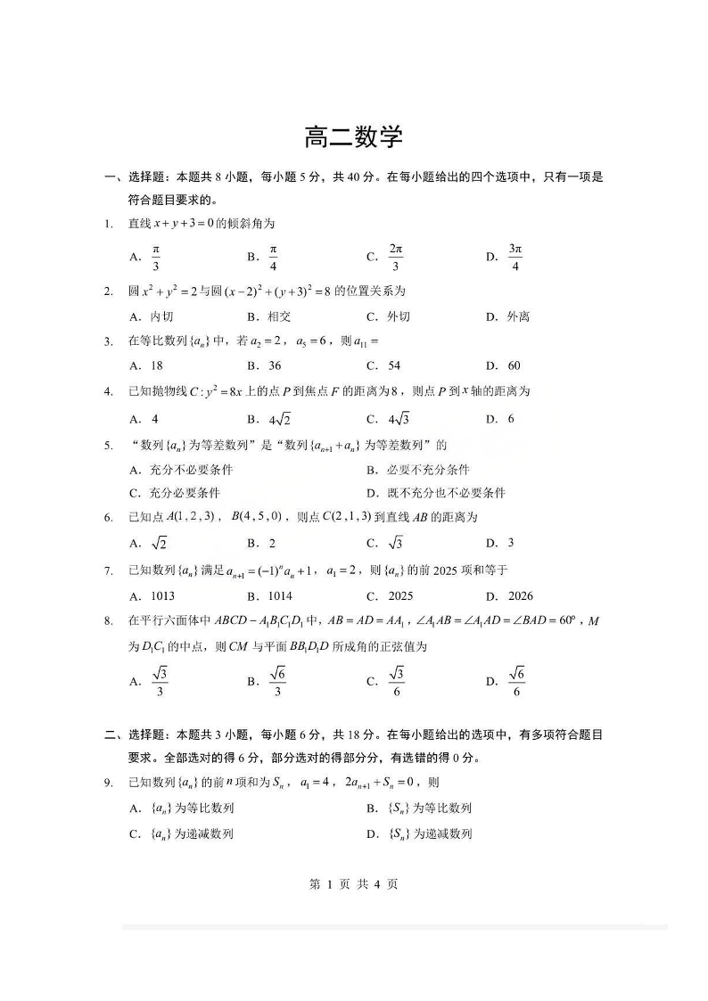 高二数学(A卷)+答案--湖北省孝感市楚天协作体2025-2026学年度上学期高二年级期末考试