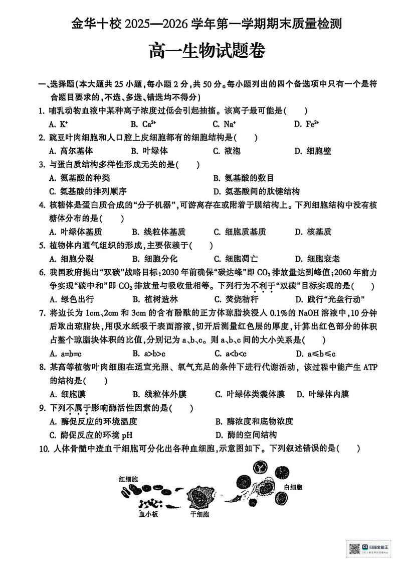 高一生物+答案--浙江省金华十校2025-2026学年高一上学期2月期末考试