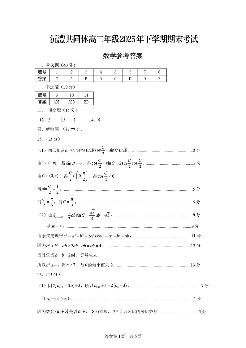 高二数学答案--湖南省常德市沅澧共同体2025-2026学高二上学期期末考试