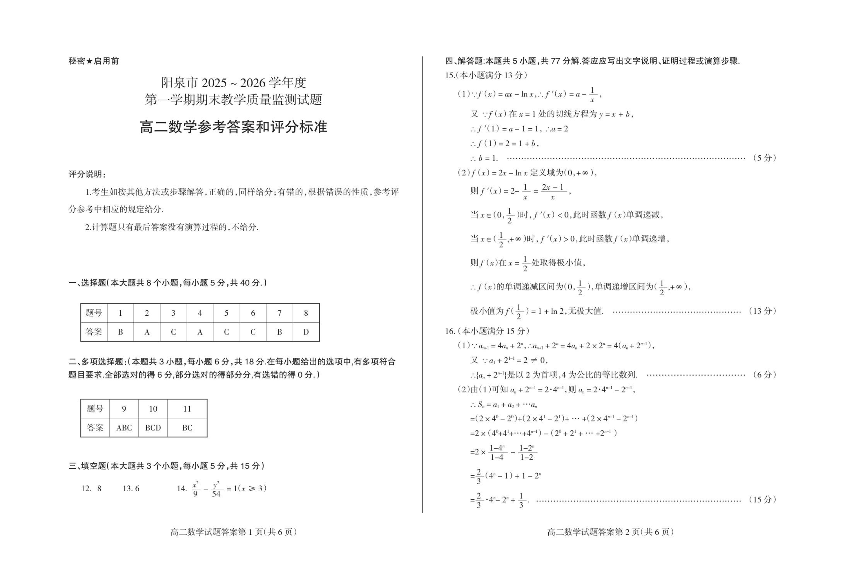 高二数学答案--山西省阳泉市2025-2026学年高二上学期期末考试