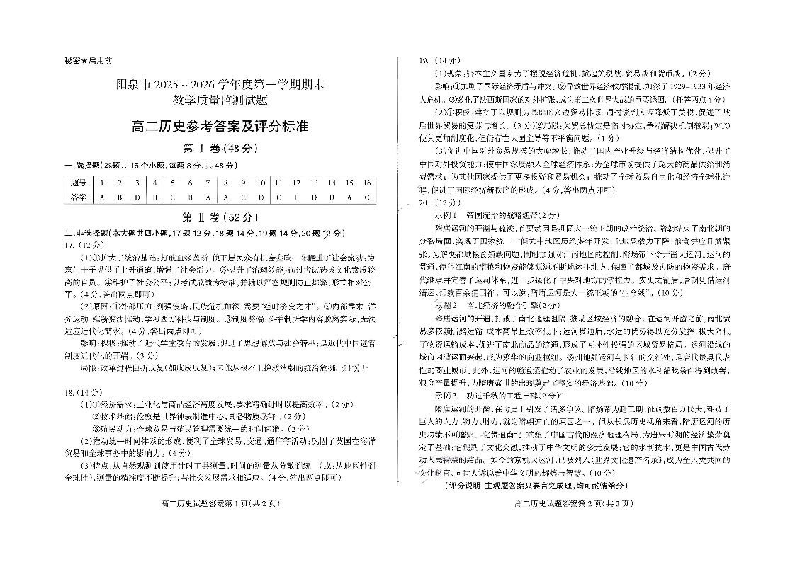 高二历史答案--山西省阳泉市2025-2026学年高二上学期期末考试