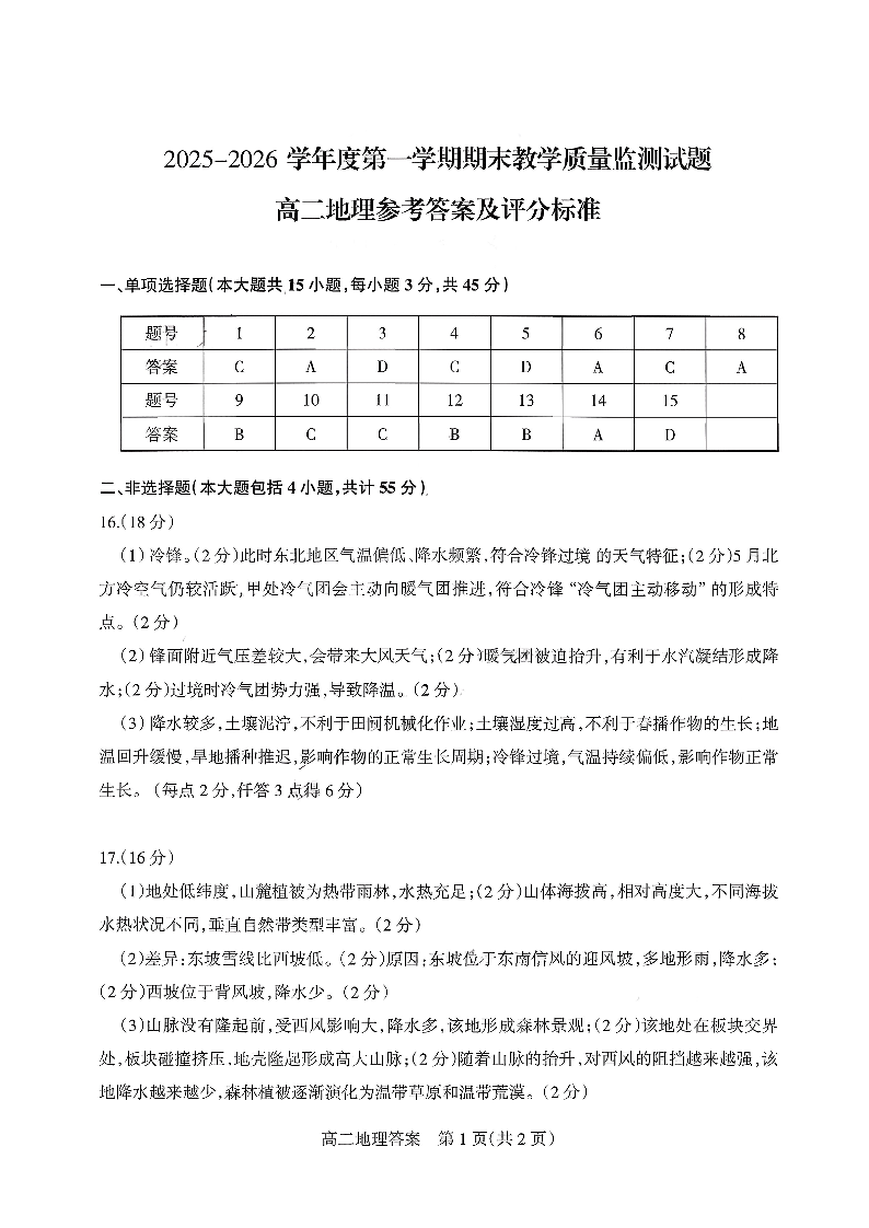 高二地理答案--山西省阳泉市2025-2026学年高二上学期期末考试
