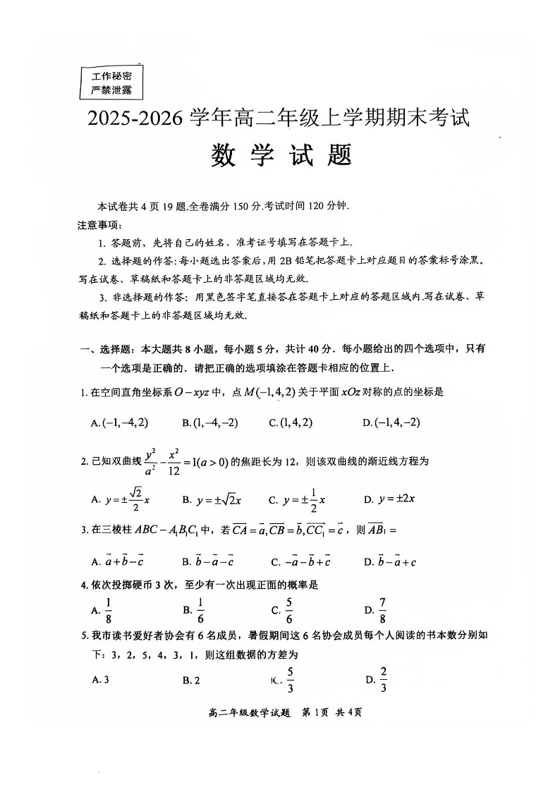 高二数学--四川省自贡市2025-2026学年高二上学期1月期末考试