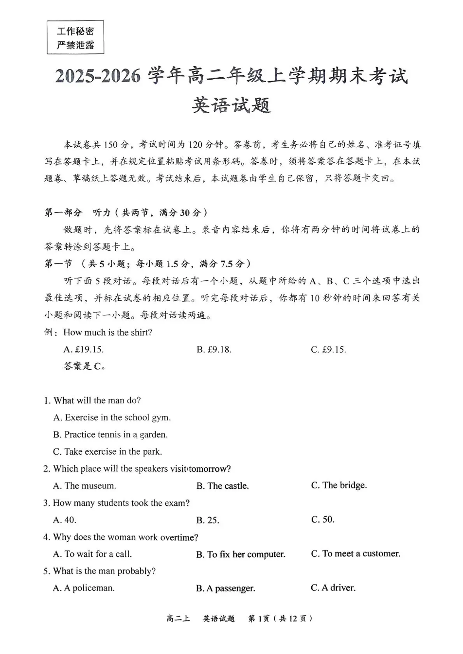 高二英语--四川省自贡市2025-2026学年高二上学期1月期末考试