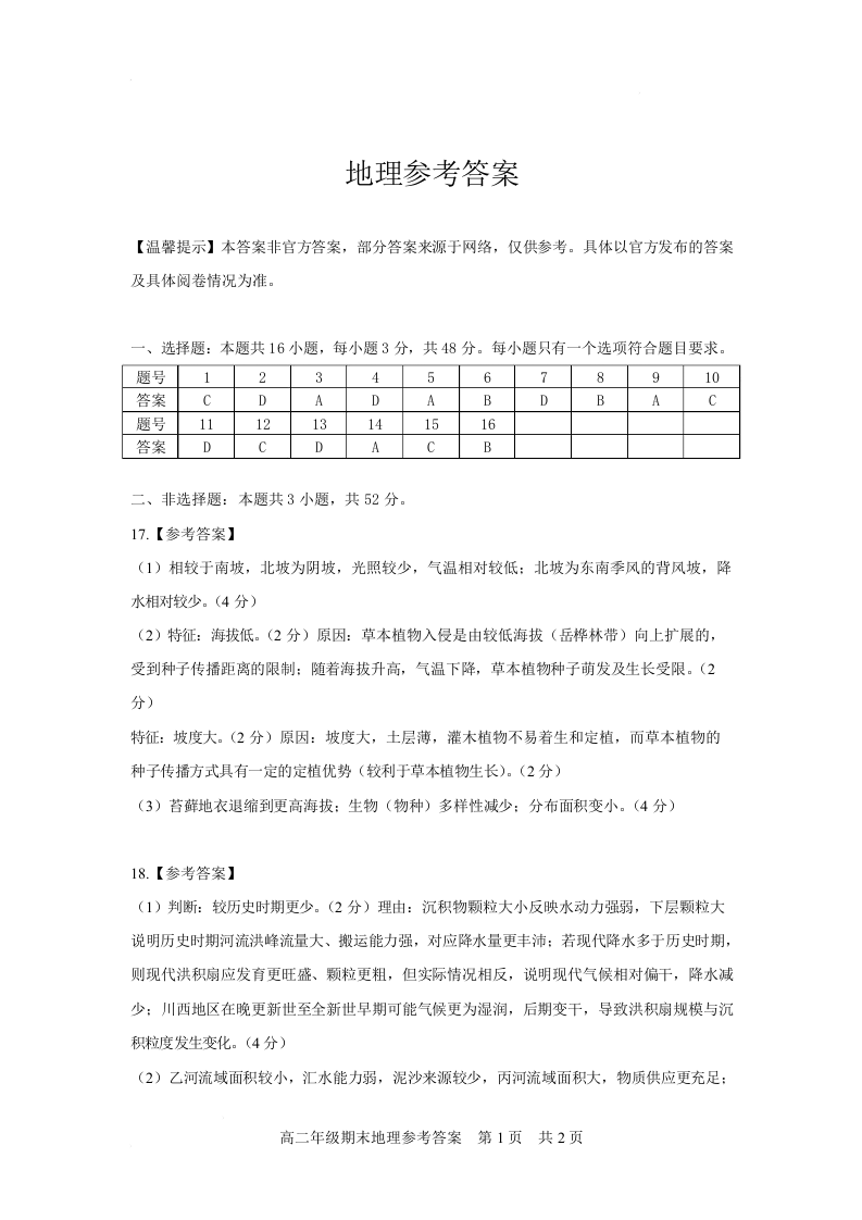 高二地理答案--四川省自贡市2025-2026学年高二上学期1月期末考试