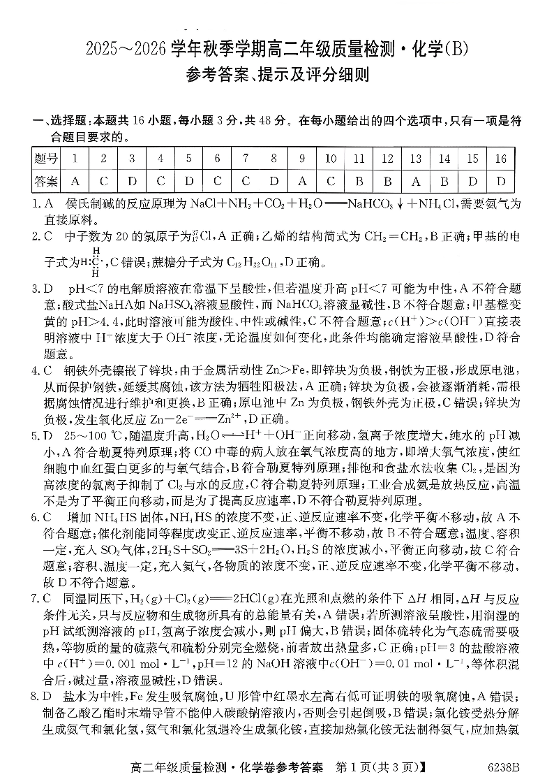 高二化学答案--云南省昭通市多县2025-2026学年高二上学期期末