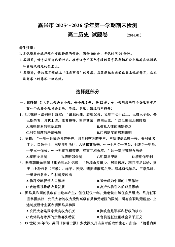 高二历史--浙江省嘉兴市2025-2026学年高二上学期期末考试