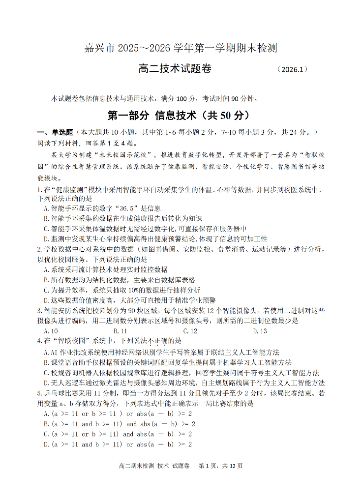 高二技术--浙江省嘉兴市2025-2026学年高二上学期期末考试