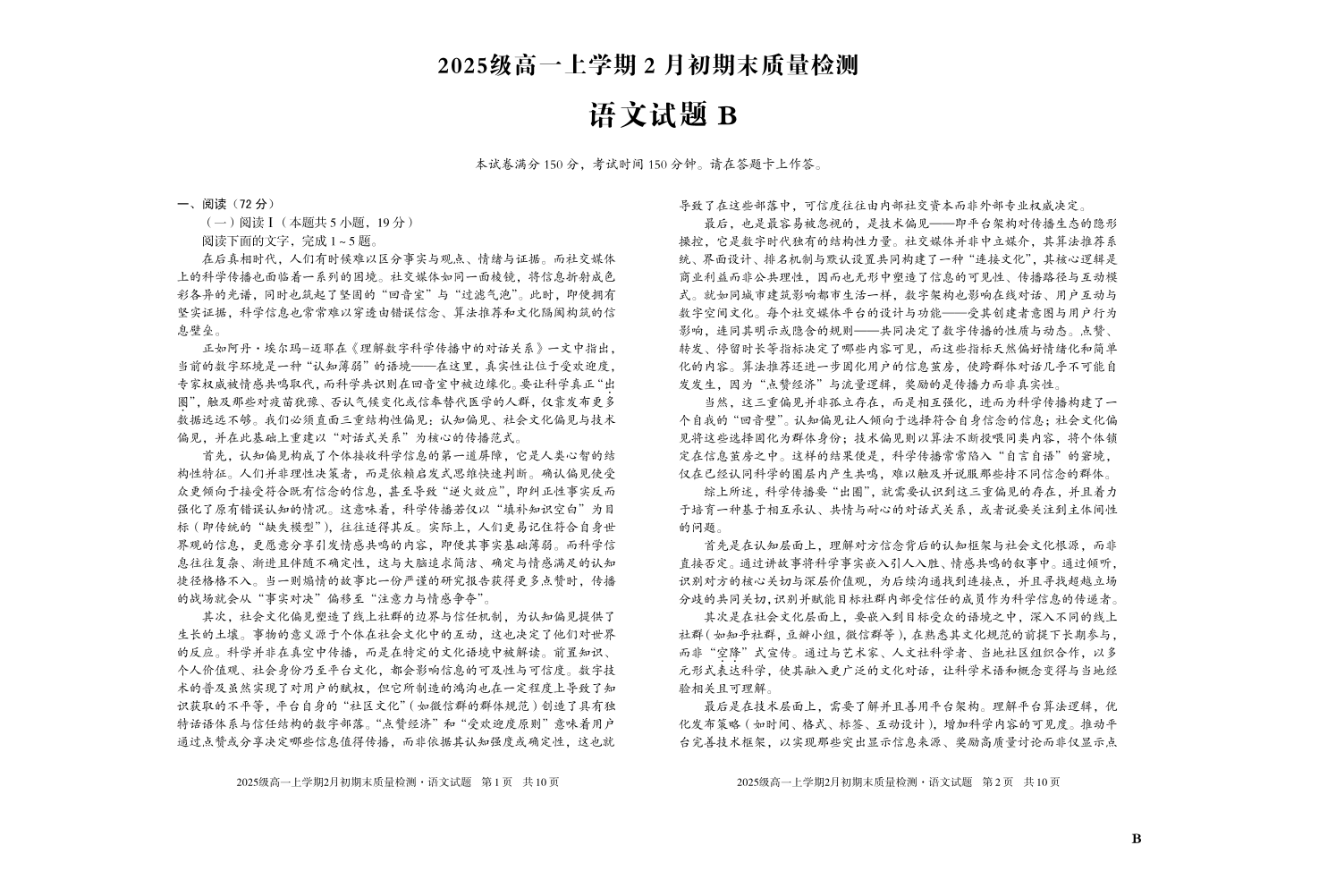 高一语文B--安徽省A10联盟2025-2026学年高一上学期2月初期末质量检测