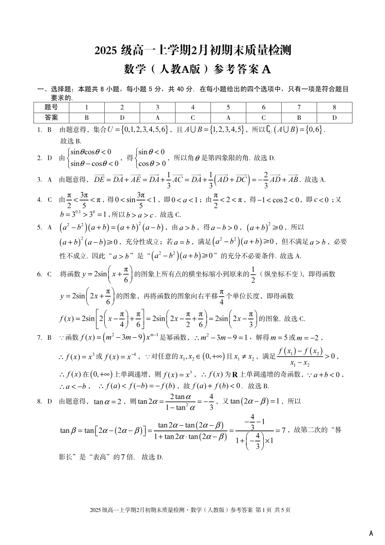 高一数学A答案--安徽省A10联盟2025-2026学年高一上学期2月初期末质量检测