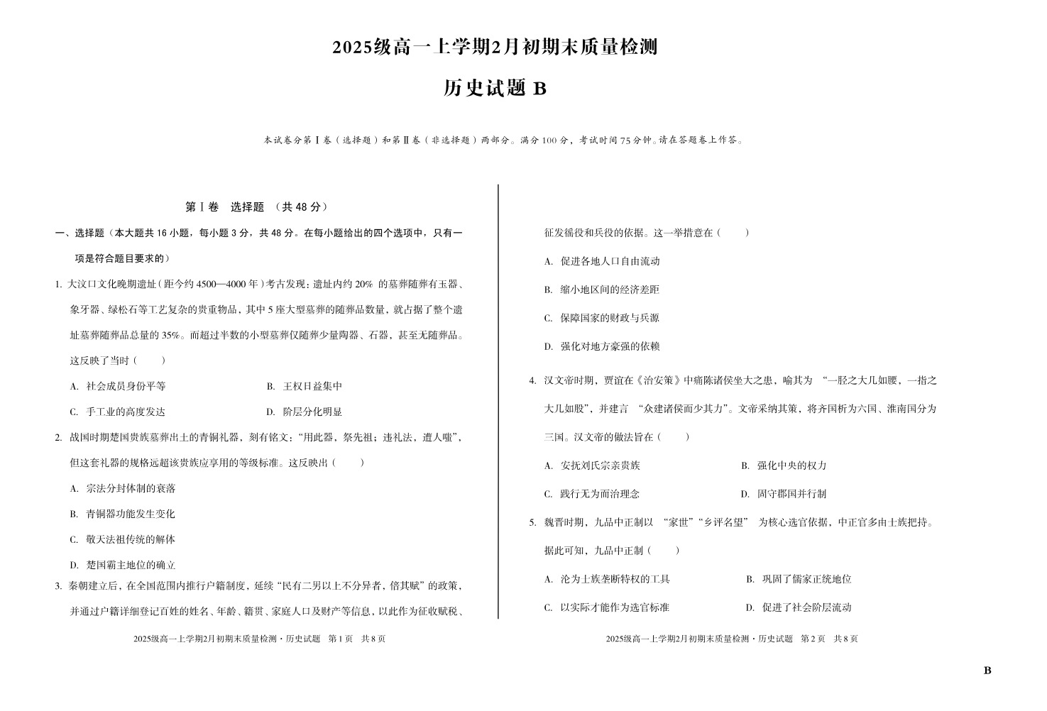 高一历史B--安徽省A10联盟2025-2026学年高一上学期2月初期末质量检测
