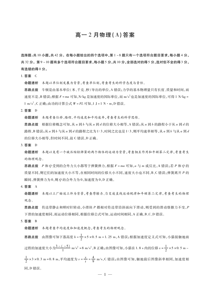 高一物理答案--安徽省合肥六中等学校2025-2026学年高一上学期2月期末考试