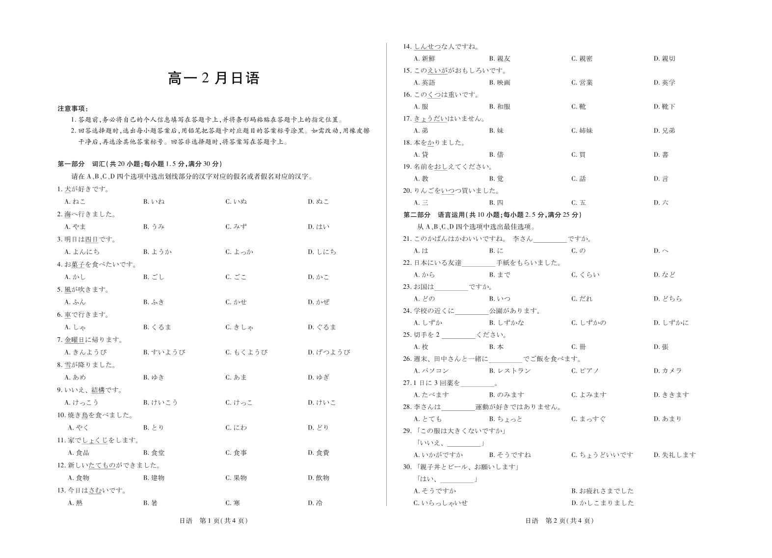 高一日语--安徽省合肥六中等学校2025-2026学年高一上学期2月期末考试